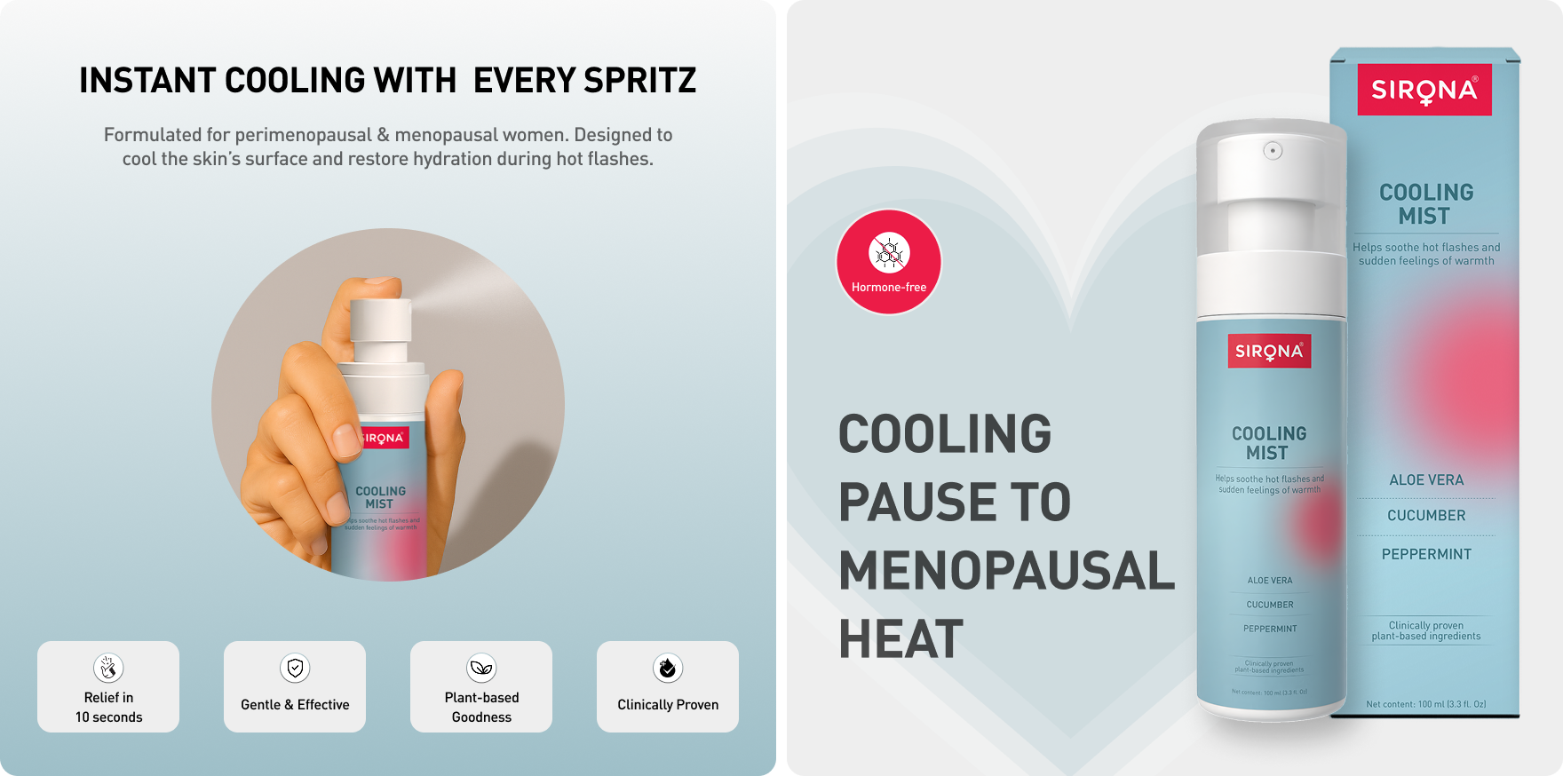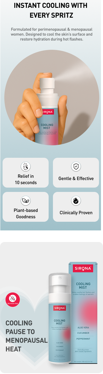 Hot flashes and sudden warmth can strike anytime, leaving you restless, sweaty, and uncomfortable. Sirona Cooling Mist is your quick, natural relief solution.