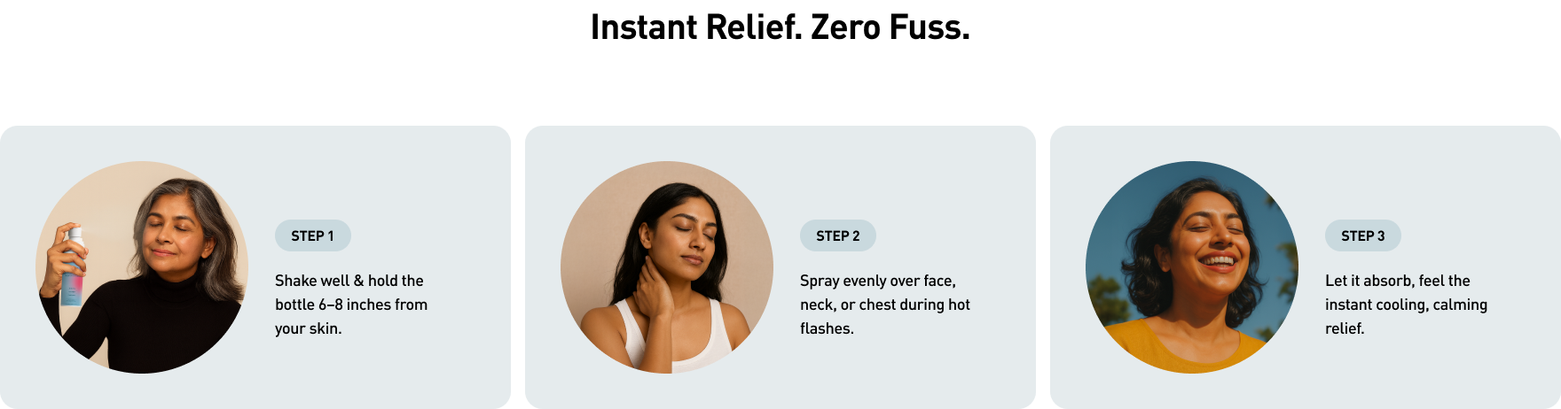 Fast-absorbing, non-sticky & skin-safe, this Cooling Mist keeps you calm, cool & confident through every phase of menopause.