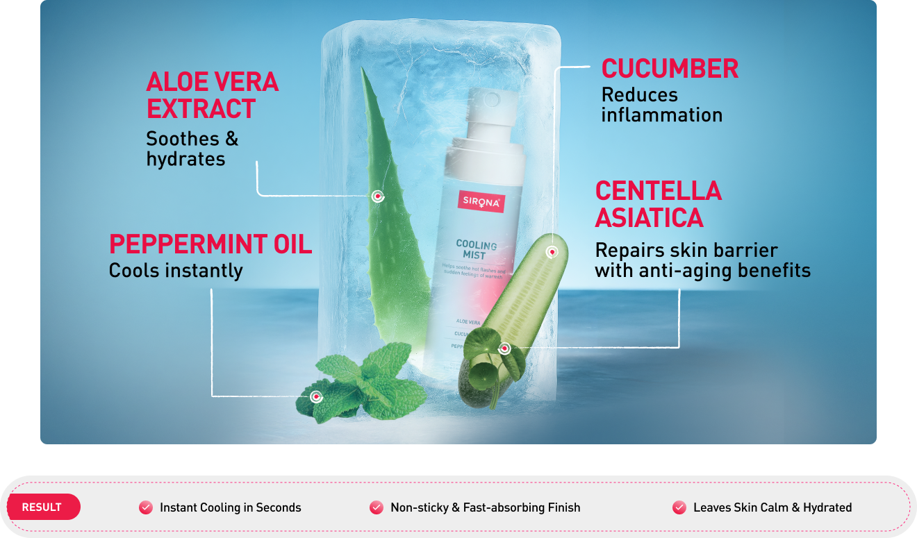 Formulated with clinically proven, plant-based ingredients like Peppermint, Aloe Vera, Cucumber, Gotu Kola, and Eucalyptus Oil, this Ayurvedic proprietary mist instantly cools the skin, reduces heat sensations, and restores hydration.