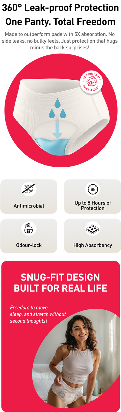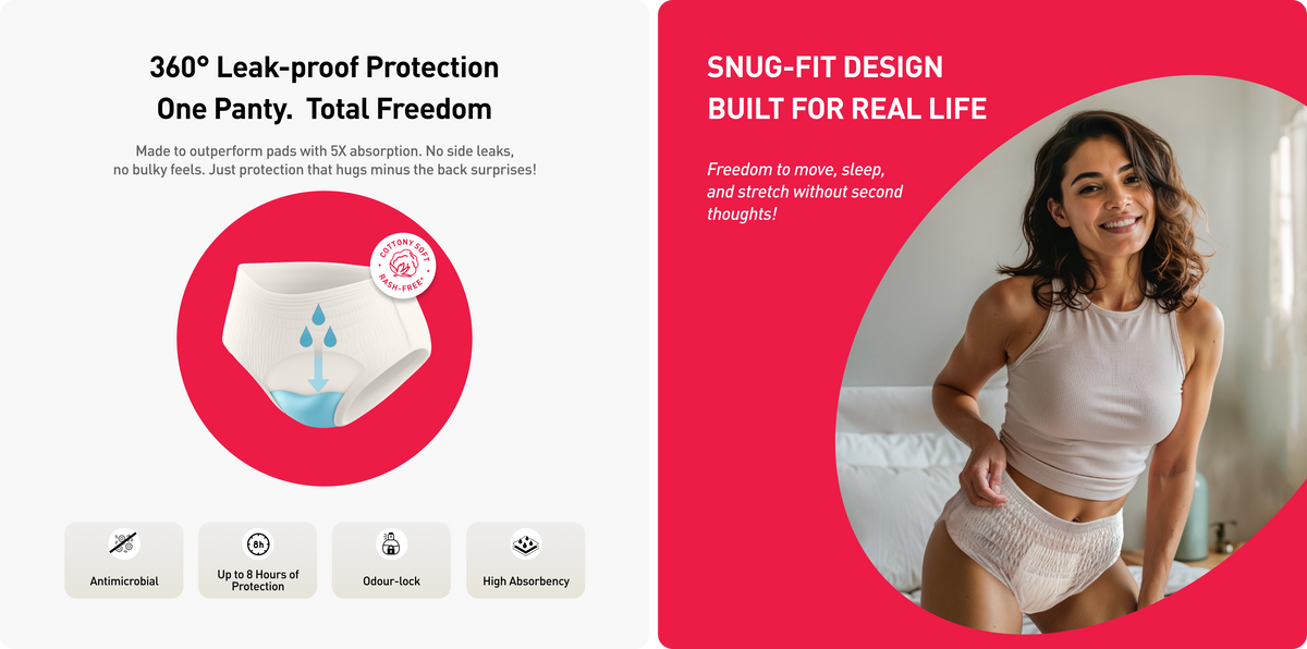 Super absorbent MagicStitch™ Technology & DryCore360™ gives stain-free protection without the bulky pad feels.
