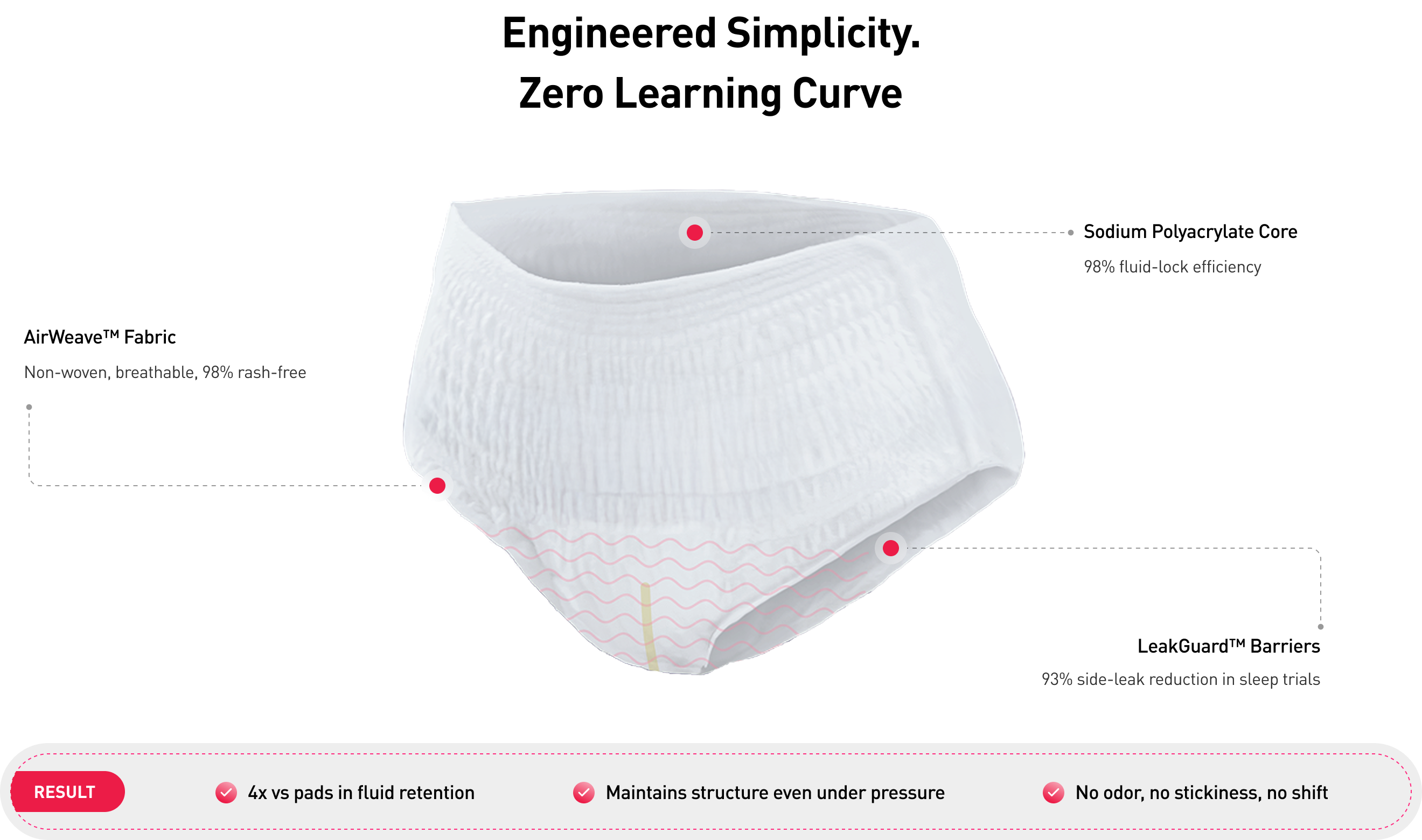 Solution: Sirona Disposable Period Panties are designed using DryCore360™ Technology, offering all-around protection and comfort that moves with you, even through heavy flow and overnight wear.