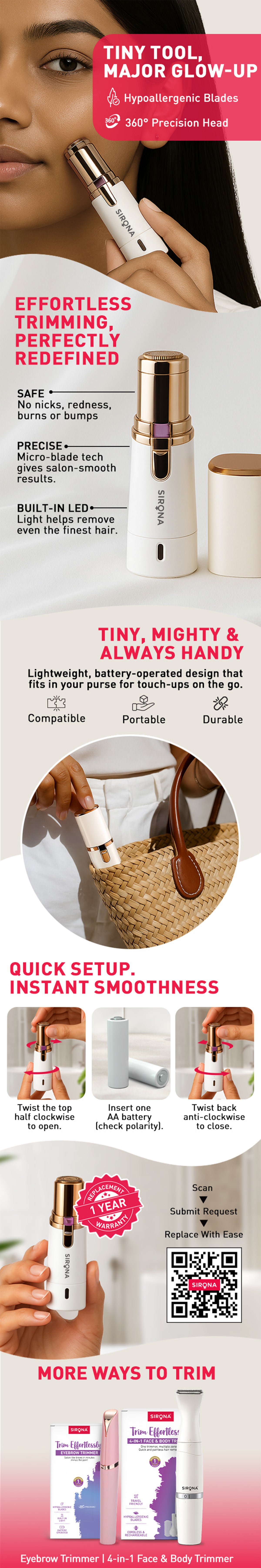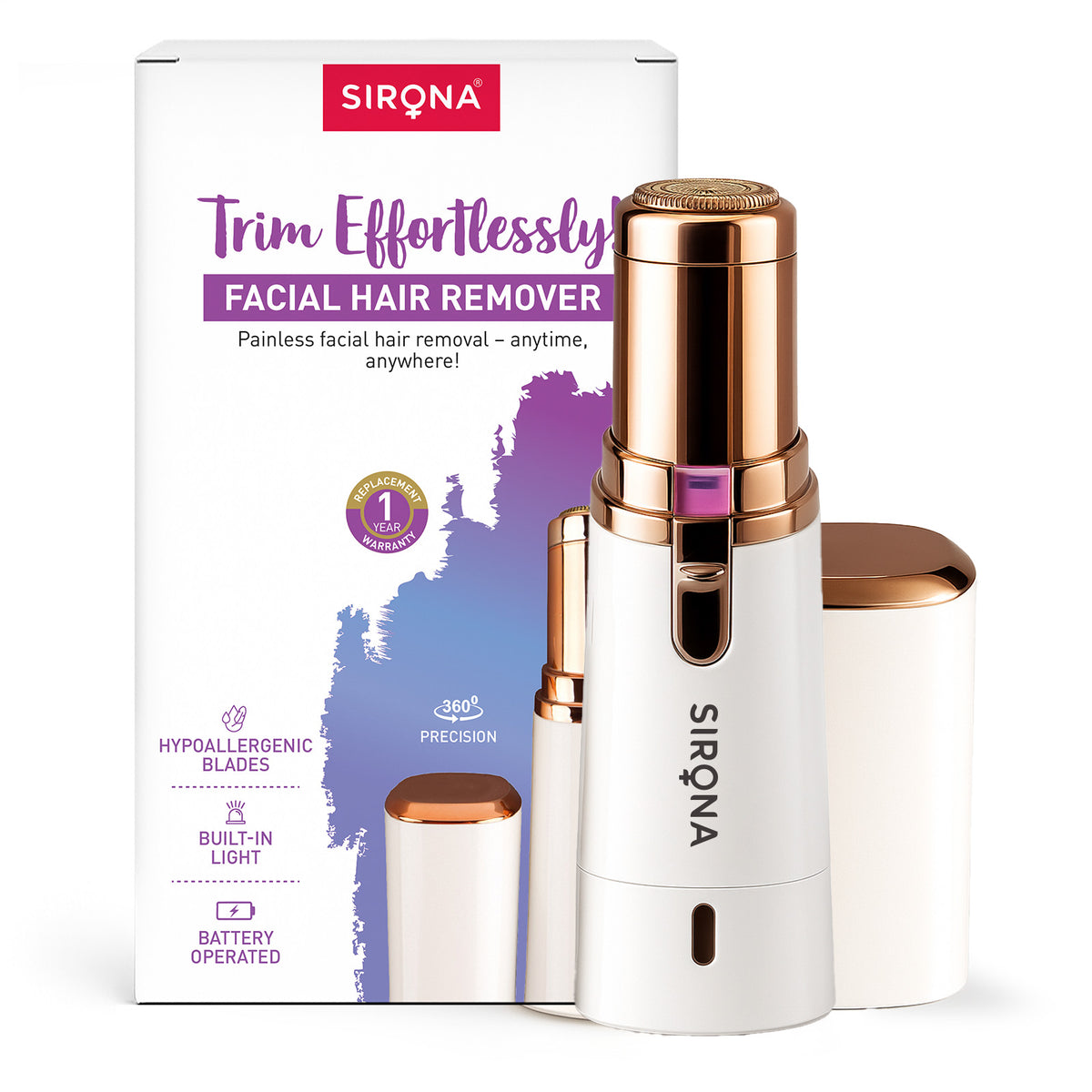 Step into a new era of pain-free facial grooming with the Sirona Facial Hair Remover—your go-to tool for quick, gentle, and precise trimming. Unlike waxing or threading, which can be harsh on your skin, this trimmer glides effortlessly to remove unwanted facial hair without pain, redness, or irritation. Its 360° stainless steel head and built-in LED light ensure complete precision, even for the finest hair on your upper lip, chin, forehead, and sideburns.Designed with an ergonomic grip and low-noise motor, it fits comfortably in your hand, making grooming effortless wherever you are. Compact and battery operated, it’s perfect for at-home use or travel touch-ups. Made with hypoallergenic blades, it’s safe for all skin types and ensures a smooth finish every single time.