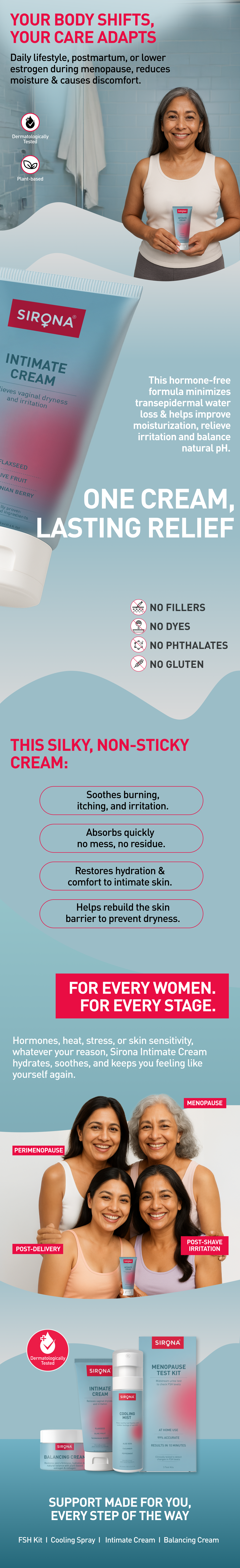 Solution: Sirona Intimate Cream is a gentle, hormone-free formula that provides comfort and hydration to intimate skin. It calms irritation and maintains the pH balance of your intimate area.