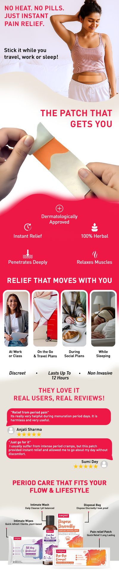 Solution: Sirona Pain Patch offers instant relief for up to 10-12 hours with a cooling blend of natural ingredients like Menthol & Eucalyptus Oil.