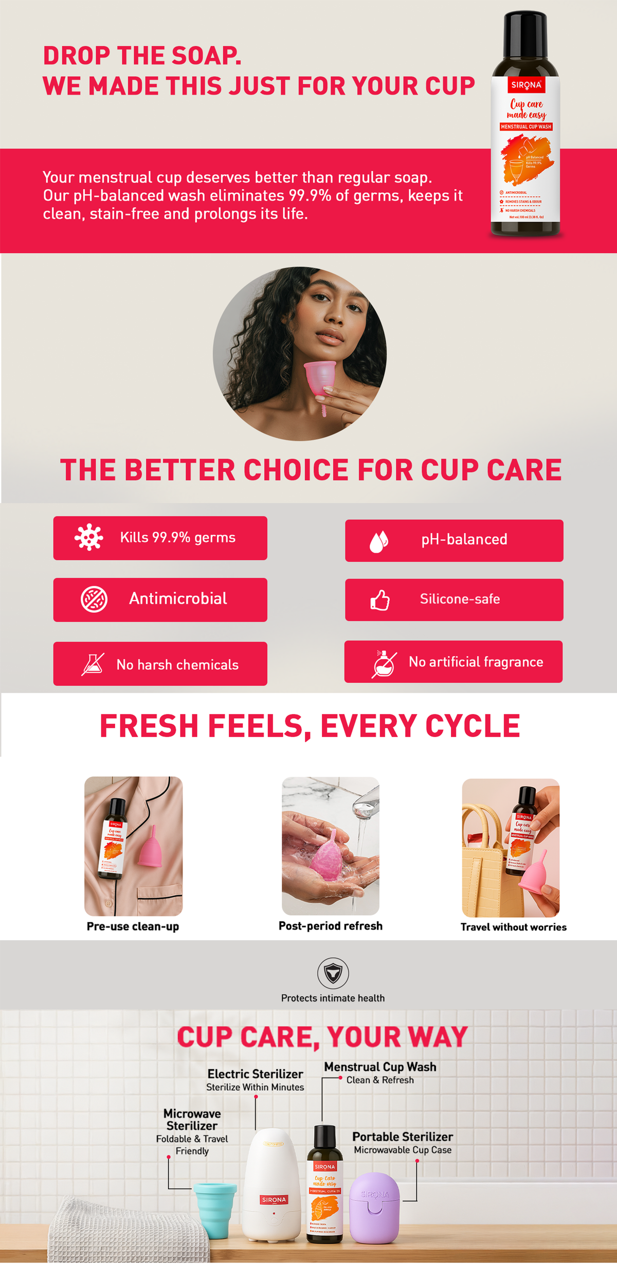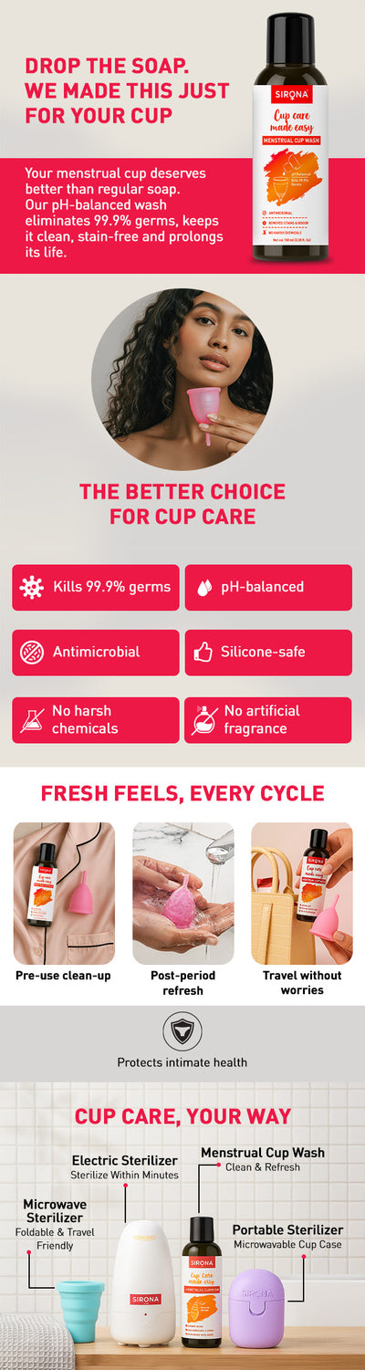 It is necessary to clean your cup between 2 cycles and also during the course of your menstrual flow to maintain the highest level of hygiene. Use Sirona Menstrual Cup wash and stay away from odour, infections, and rashes.