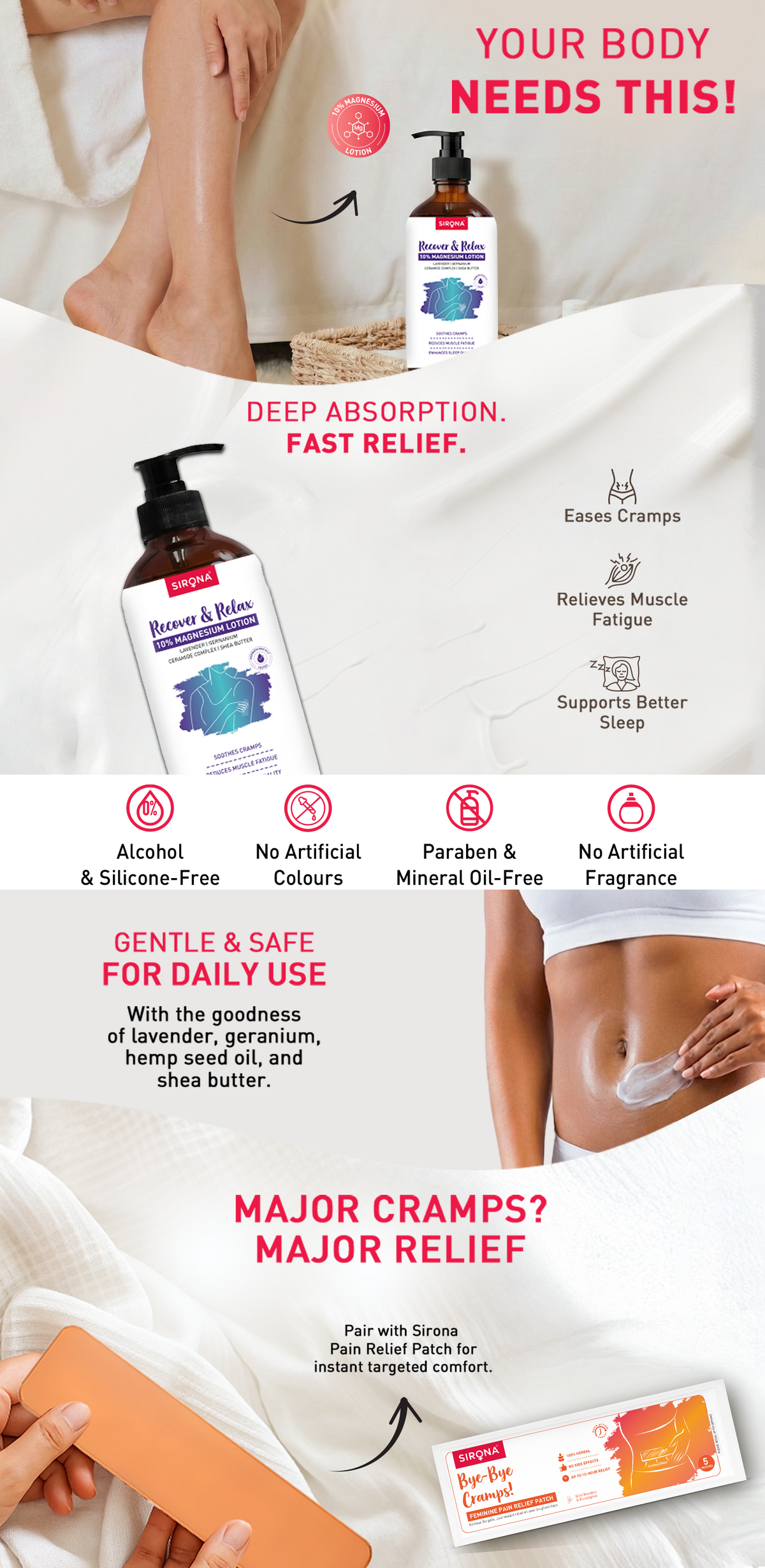 Description Relax, recover, and rest better with Sirona 10% Magnesium Lotion. A fast-absorbing formula that eases muscle fatigue, soothes cramps, and enhances sleep quality while nourishing your skin.