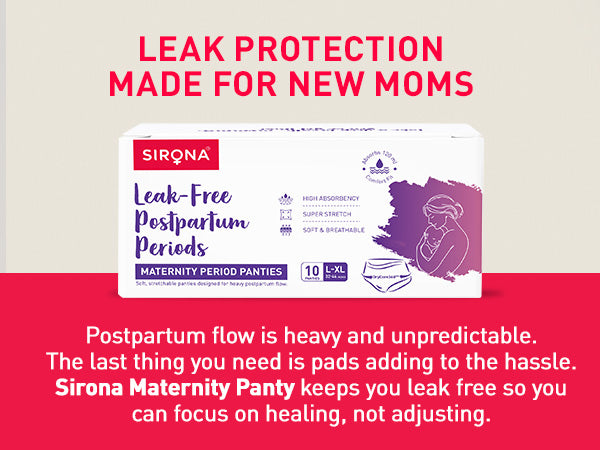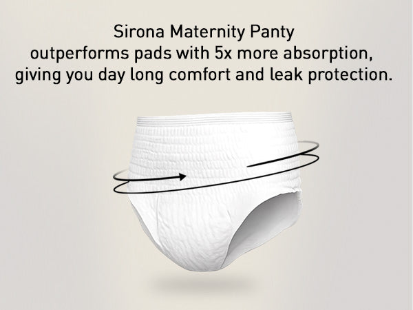 Solution: Sirona Maternity Period Panties are designed using DryCore 360™ Technology, offering all-around protection and stretchable comfort, so moms can heal without any mess or stress.