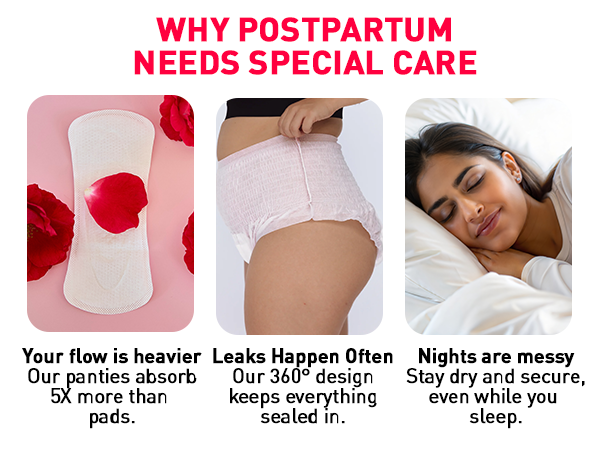 Problem: Bulky pads, constant leaks, and zero comfort. New moms deserve better period care during their postpartum recovery, which can handle intense flow with large clots and sudden gushes.