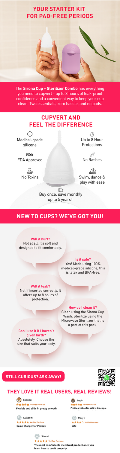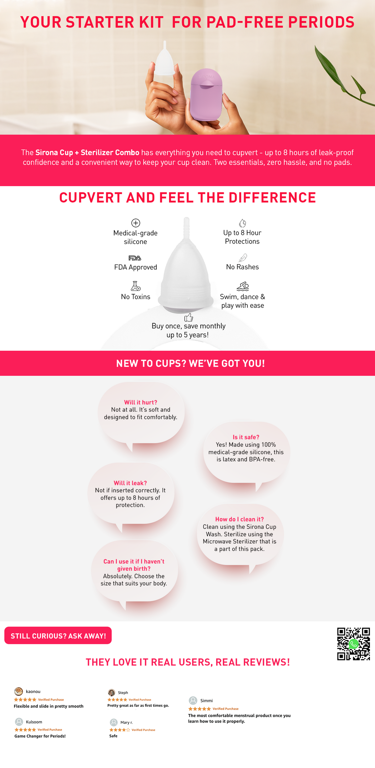 Meet the duo your period’s been waiting for: Sirona Menstrual Cup + Microwaveable Sterilizer. The cup is made from 100% medical-grade silicone for up to 8 hours of leak-proof, rash-free comfort, allowing you to work, travel, dance, and sleep worry-free.