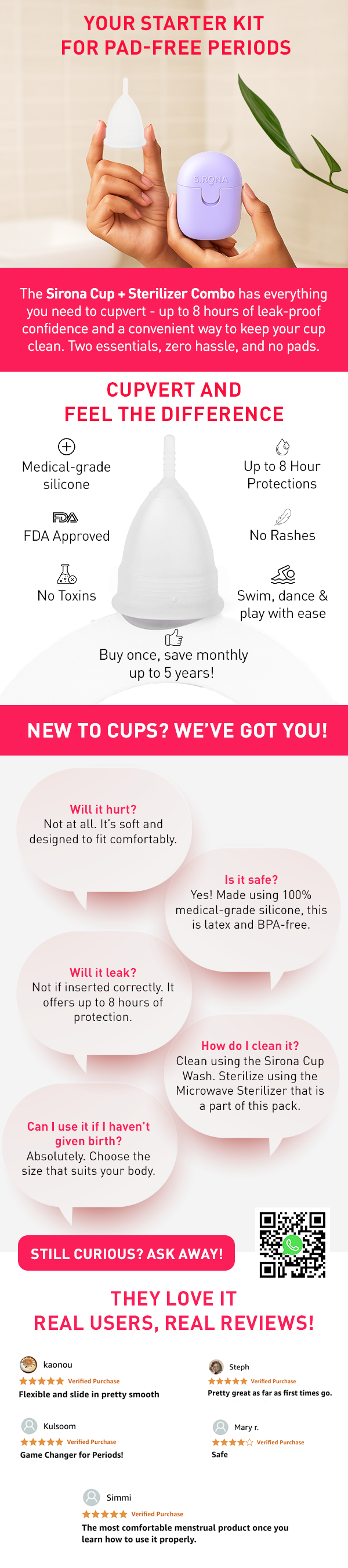 i was fed up using sanitary pads...as i have regular periods bt heavy flow...so needed to change pads frequently....i wa looking for good brand to buy mensural cup..nd my sister suggested me sirona ...now i am satisfied ...so comfortable...having stress free happy periods