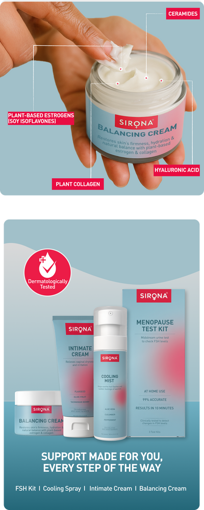 Solution: Sirona Balancing Cream is especially crafted for menopausal skin. This rich face and body cream deeply hydrates, restores the skin barrier, and improves firmness and elasticity.