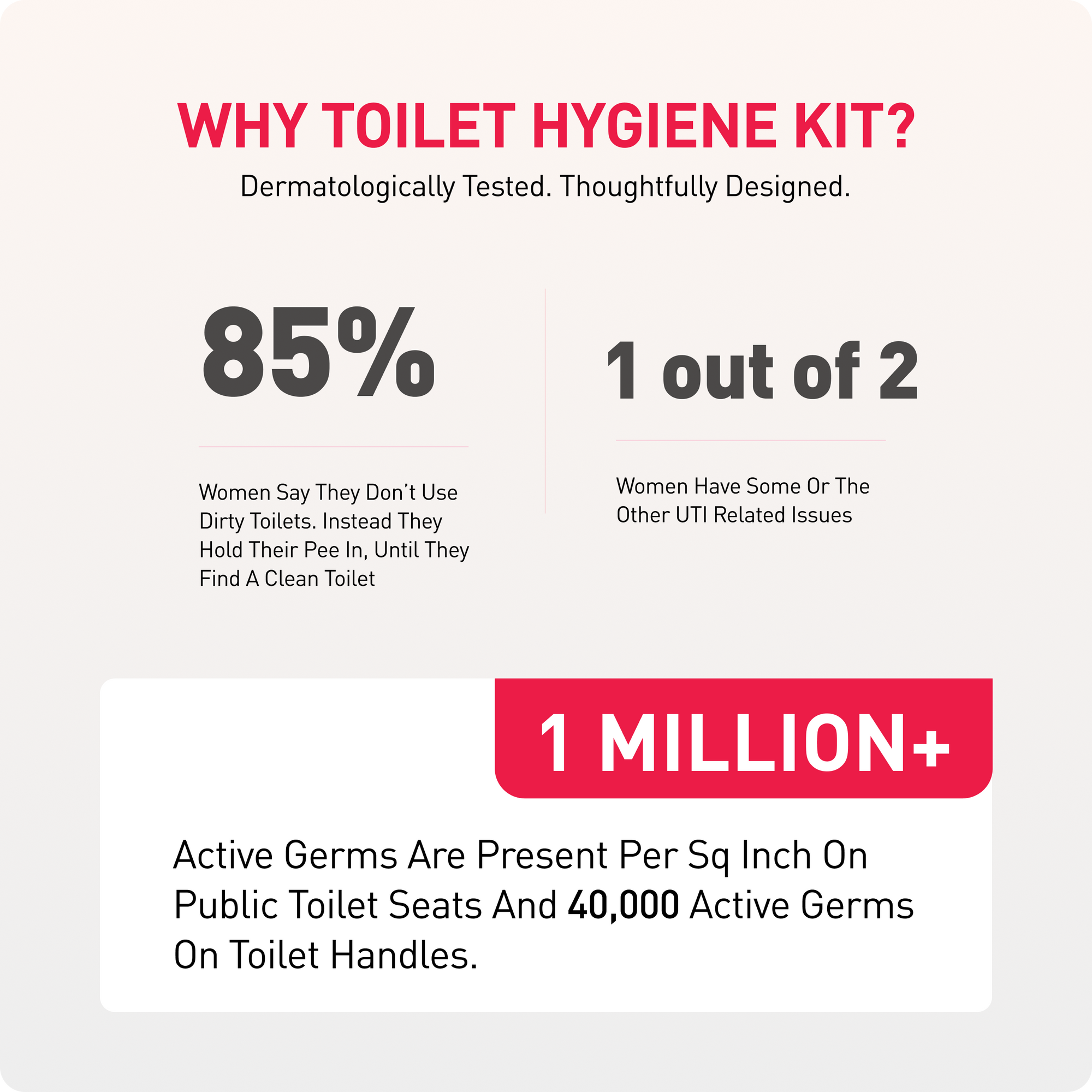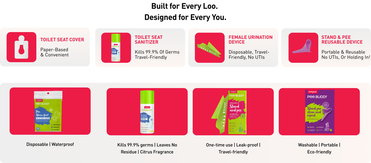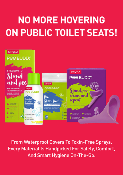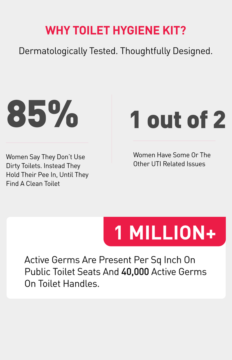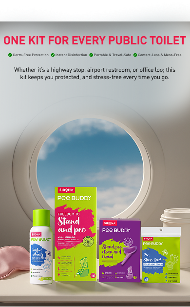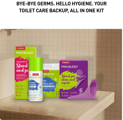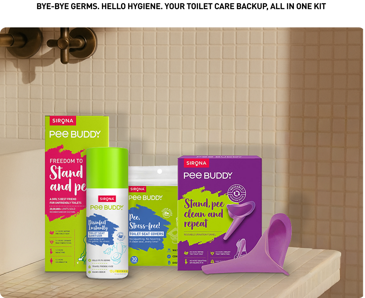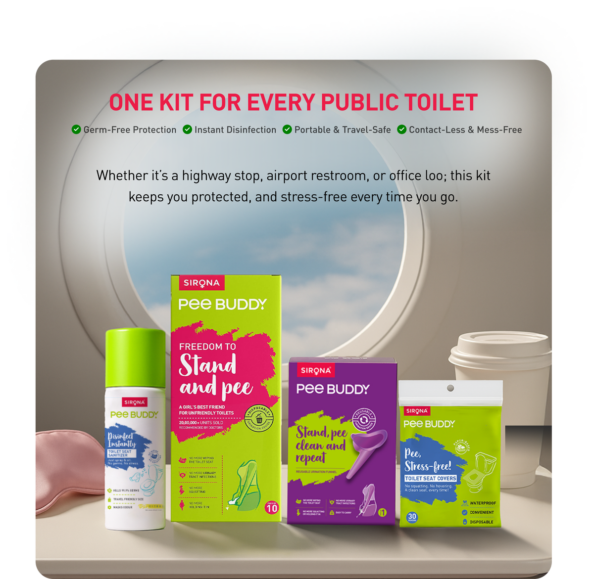 Solution: The Sirona Toilet Hygiene Kit is your all-in-one saviour for stress-free toilet visits. Packed with four essentials: toilet seat covers, toilet seat sanitiser spray, disposable female urination devices, and a reusable Stand & Pee device, ensuring you never have to compromise on hygiene, whether at airports, highways, concerts, or treks.